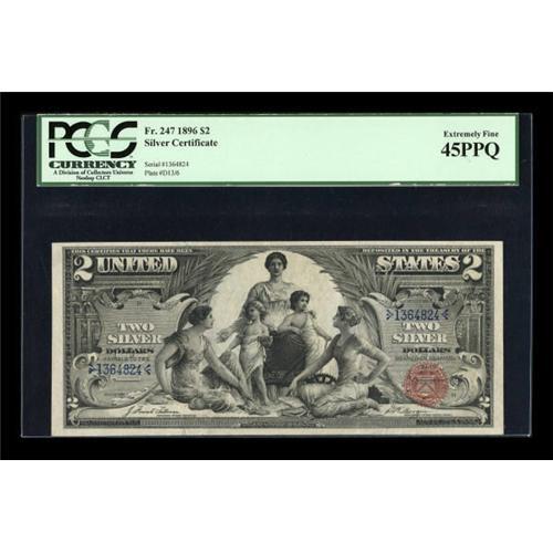 <B>Fr. 247 $2 1896 Silver Certificate PCGS Extremely Fine 45PPQ.</B></I> A really nice XF, with broad margins and just two folds that we can see.<BR><BR><b>Shipping:</b> Coins & Currency (<a target="_blank" href="http://www.heritageauctions.com/common/shipping.php">view shipping information</a>)