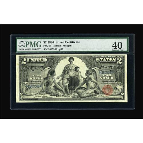 <B>Fr. 247 $2 1896 Silver Certificate PMG Extremely Fine 40.</B></I> A broadly margined, brightly inked note exhibiting three vertical folds and some light handling.<B><BR></B></I><I>From The Warren Marshall Collection</B></I><BR><BR><b>Shipping:</b> Coins & Currency (<a target="_blank" href="http://www.heritageauctions.com/common/shipping.php">view shipping information</a>)