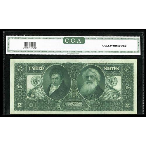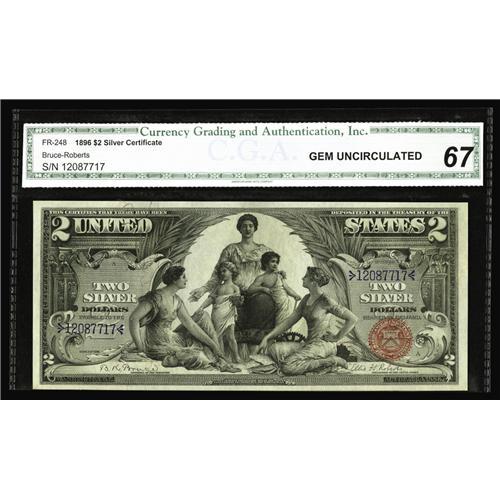 <B>Fr. 248 $2 1896 Silver Certificate CGA Gem Uncirculated 67.</B></I> A handsome Educational $2 with boardwalk margins, ideal colors, and original embossing that can be easily seen through the encapsulation. It's hard to re-grade once a note is in a third party holder, but the 67 that this note earned, appears to us to be on a tad bit on the conservative side. A really pretty piece.