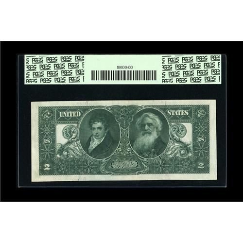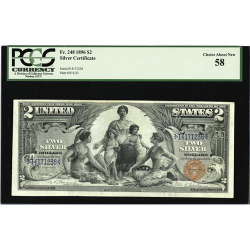 <B>Fr. 248 $2 1896 Silver Certificate PCGS Choice About New 58.</B></I> Though no immediate faults can be seen the note has all the complements of a choice example in our opinion.