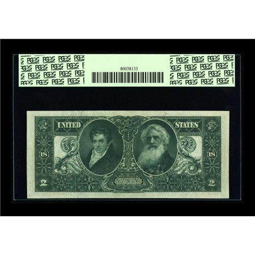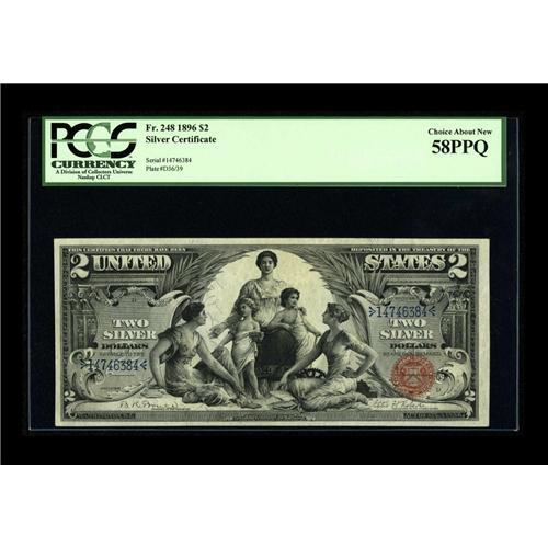 <B>Fr. 248 $2 1896 Silver Certificate PCGS Choice About New 58PPQ.</B></I> The margins on this note are simply Gem like. A small amount of wear has knocked this gorgeous example out of the New grade. Bright and colorful, the surfaces retain the look of a note worth three times as much.<BR><BR><b>Shipping:</b> Coin/Currency (<a target="_blank" href="http://www.heritageauctions.com/common/shipping.php">view shipping information</a>)