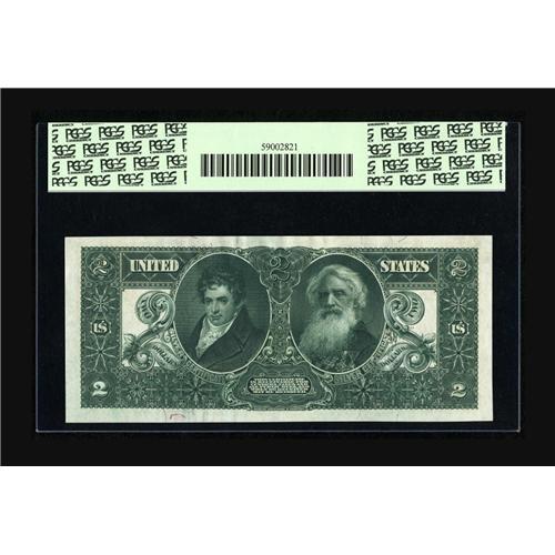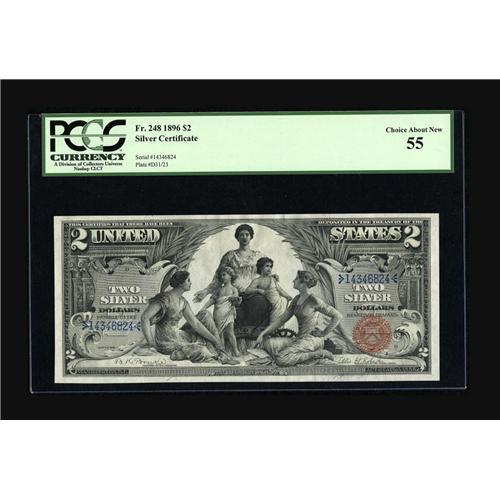 <B>Fr. 248 $2 1896 Silver Certificate PCGS Choice About New 55.</B></I> This $2 Educational has the kind of boardwalk margins that 68s are made of. A broad corner fold at the lower left has held this pristine appearing piece 12 points lower than its visual level. A real beauty.<BR><BR><b>Shipping:</b> Coin/Currency (<a target="_blank" href="http://www.heritageauctions.com/common/shipping.php">view shipping information</a>)