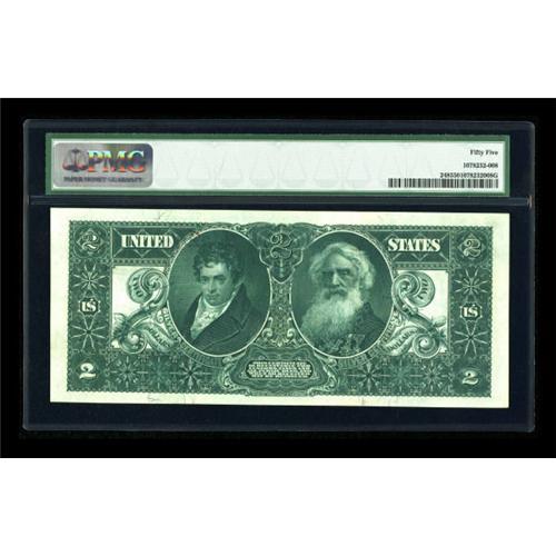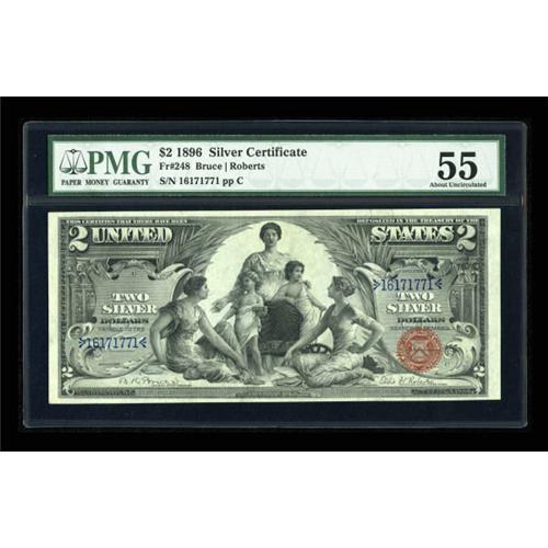 <B>Fr. 248 $2 1896 Silver Certificate PMG About Uncirculated 55.</B></I> The design of the $2 Educational is one of the nicer engravings seen on US currency from a bygone era. The portraits of Fulton and Morse are quite lifelike on this high grade PMG certified $2 Ed.<BR><BR><b>Shipping:</b> Coins & Currency (<a target="_blank" href="http://www.heritageauctions.com/common/shipping.php">view shipping information</a>)