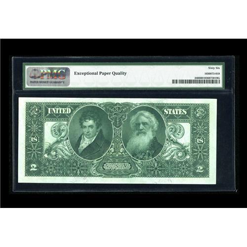 <B>Fr. 248 $2 1896 Silver Certificate PMG Gem Uncirculated 66 EPQ.</B></I> This highly desirable design type is blessed with wide margins all around. The originality attested to by the PMG EPQ designation. We are excited with the opportunity to have available another Gem example for your approval. Simply blast white with deep, vivid inks.<BR><BR><b>Shipping:</b> Coin/Currency (<a target="_blank" href="http://www.heritageauctions.com/common/shipping.php">view shipping information</a>)