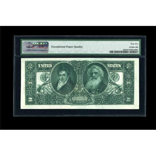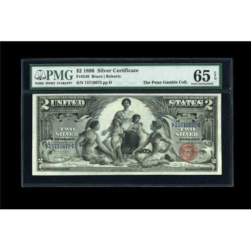 <B>Fr. 248 $2 1896 Silver Certificate PMG Gem Uncirculated 65 EPQ.</B></I> A very well margined note with bright colors and original embossing that can be easily seen through the third party holder. While certainly not rare at this grade level, the constant pressure on the marketplace for these attractive Deuces holds the price level near the five-figure mark. <BR><I>From The Peter Gamble Collection.</B></I><BR><BR><b>Shipping:</b> Coins & Currency (<a target="_blank" href="http://www.heritageauctions.com/common/shipping.php">view shipping information</a>)