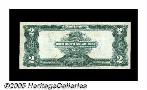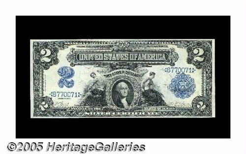 <B>Fr. 249 $2 1899 Silver Certificate Gem New.</B></I> The first signature combination of the 1899 Deuces, and a very beautiful example. It has its original embossing, good color and terrific margins. These early 1899 Deuces employed a different color of blue than the later notes, making them instantly recognizable without checking the signatures.