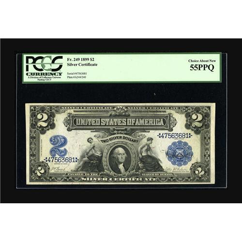 <B>Fr. 249 $2 1899 Silver Certificate PCGS Choice About New 55PPQ.</B></I> A few corner tip folds are visible on this broadly margined, wholly original turn-of-the-century Deuce.<BR><BR><b>Shipping:</b> Coin/Currency (<a target="_blank" href="http://www.heritageauctions.com/common/shipping.php">view shipping information</a>)