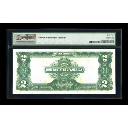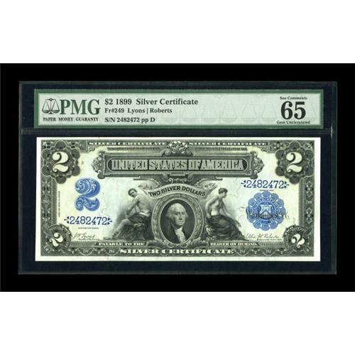 <B>Fr. 249 $2 1899 Silver Certificate PMG Gem Uncirculated 65 EPQ.</B></I> Perfect front to back centering is noted on this fully margined Gem. The overprint is a deep blue and the paper especially vivid.<BR><BR><b>Shipping:</b> Coins & Currency (<a target="_blank" href="http://www.heritageauctions.com/common/shipping.php">view shipping information</a>)