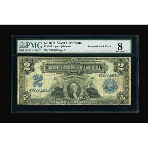 <B>Fr. 249 $2 1899 Silver Certificate PMG Very Good 8.</B></I> A neat inverted back on an issue that reports five examples for this Friedberg number. A bit of margin roughness is noticed.<BR><BR><b>Shipping:</b> Coins & Currency (<a target="_blank" href="http://www.heritageauctions.com/common/shipping.php">view shipping information</a>)