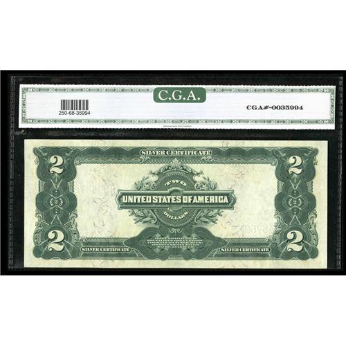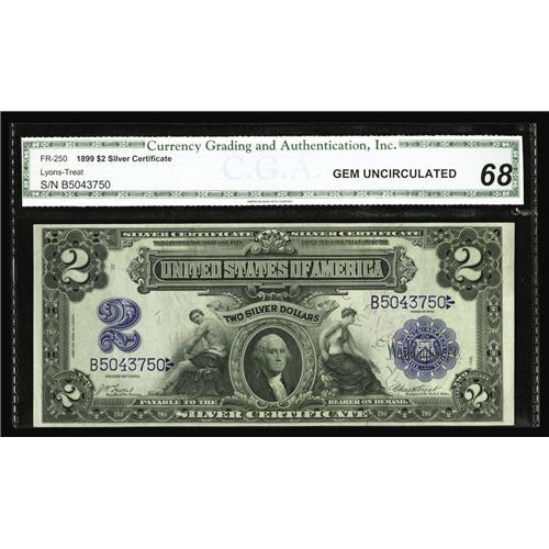 <B>Fr. 250 $2 1899 Silver Certificate CGA Gem Uncirculated 68.</B></I> The deep original embossing can be plainly viewed through the third party holder on this broadly margined, fully bright Deuce. Fr. 250 is one of the scarcer numbers of this type with only about 60 examples known in all grades combined--very few of them, if any, will be the condition rivals of this beauty.