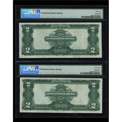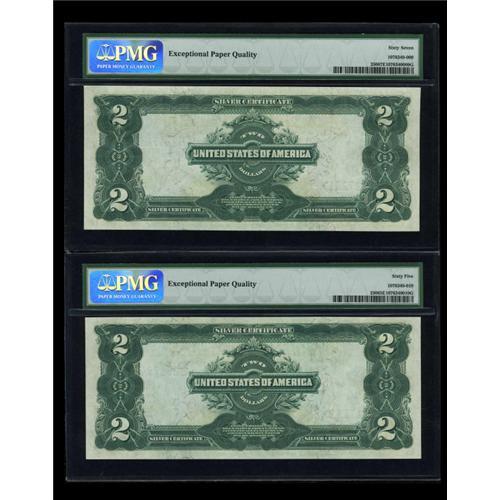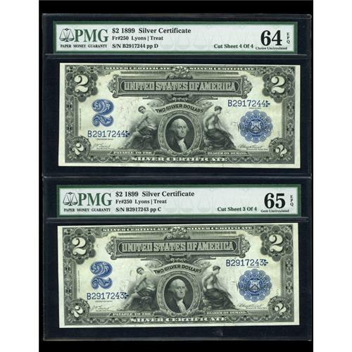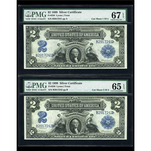 <B>Fr. 250 $2 1899 Silver Certificates Cut Sheet of Four PMG Superb Gem Unc 67 EPQ, Gem Uncirculated 65 EPQ (2), Choice Uncirculated 64 EPQ.</B></I> A gorgeous almost perfect note starts off this cut sheet, that also includes two more Gem examples. All of the notes are super fresh and nicely margined. <BR><BR><b>Shipping:</b> Coins & Currency (<a target="_blank" href="http://www.heritageauctions.com/common/shipping.php">view shipping information</a>)