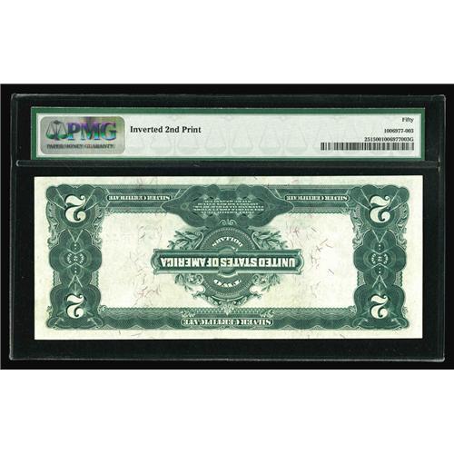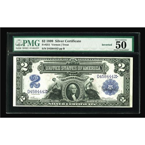 <B>Fr. 251 $2 1899 Inverted Reverse Silver Certificate PMG About Uncirculated 50.</B></I> A high grade invert which, like most large inverts, is woefully underpriced in relation to its rarity. A normal $2 Silver in this grade will realize $600 or so, while this note will likely sell for $3500 or thereabouts. Does anyone truly believe that AU $2 inverts are only six times more difficult to obtain than are normal 1899 deuces? Perhaps one out of every 200 extant 1899 twos are inverts, and probably even fewer. When collectors begin to realize the real rarity of these items, look for prices to adjust very quickly.
