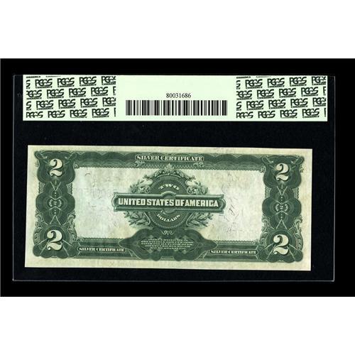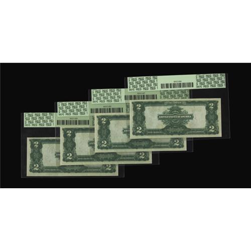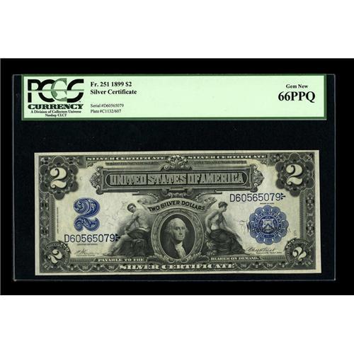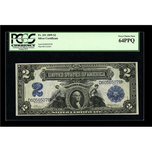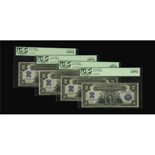 <B>Fr. 251 $2 1899 Silver Certificate Cut Sheet of Four PCGS Very Choice New 64PPQ (2), Gem New 65PPQ, Gem New 66PPQ.</B></I> This lovely cut sheet yielded two Gems, though all could have been there had a bit more care been given during cutting. The surfaces display lovely color and the original embossing is clearly seen.