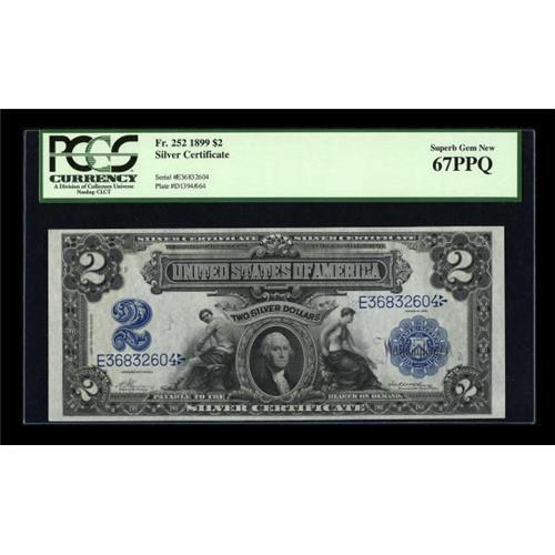 <B>Fr. 252 $2 1899 Silver Certificate PCGS Superb Gem New 67PPQ.</B></I> Hopefully one day PCGS will publish their population report for currency. PMG has only graded one example of this number at this exceptionally high level. The margins are even with dazzling color. By far one of the nicest examples for this issue we have seen.<BR><BR><b>Shipping:</b> Coins & Currency (<a target="_blank" href="http://www.heritageauctions.com/common/shipping.php">view shipping information</a>)