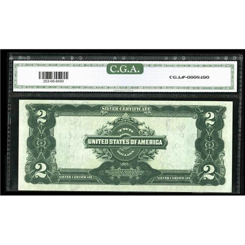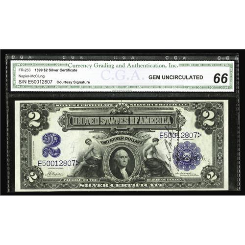 <B>Fr. 253 $2 1899 Silver Certificate CGA Gem Uncirculated 66.</B></I> A handsome 1899 Deuce that bears the bold courtesy autograph of one of the assistant Treasurers vertically to the left of the Blue Treasury Seal.