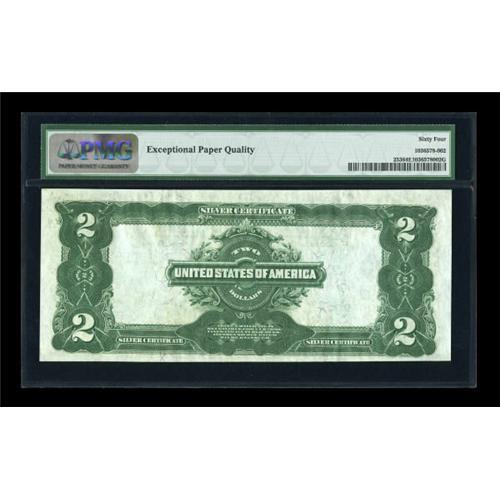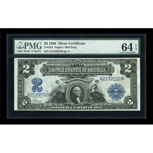 <B>Fr. 253 $2 1899 Silver Certificate PMG Choice Uncirculated 64 EPQ.</B></I> This note faces up well but the back printing is slightly off center, which has held back the grade. Nicely margined with strong embossing and bright inks, expect this quality example to realize in the area of...<BR><BR><b>Shipping:</b> Coins & Currency (<a target="_blank" href="http://www.heritageauctions.com/common/shipping.php">view shipping information</a>)