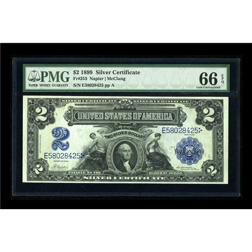 <B>Fr. 253 $2 1899 Silver Certificate PMG Gem Uncirculated 66 EPQ.</B></I> Huge margins, ideal centering and embossing that's visible through the holder are all highlights of this perfect looking turn-of-the-century Deuce.<BR><I>From The Jacob and Heather Dedman Collection</B></I><BR><BR><b>Shipping:</b> Coins & Currency (<a target="_blank" href="http://www.heritageauctions.com/common/shipping.php">view shipping information</a>)