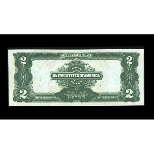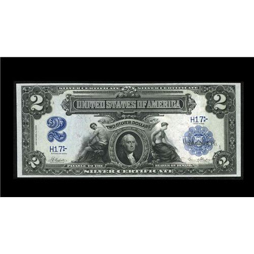 <B>Fr. 254 $2 1899 Silver Certificate Choice New.</B></I> This note appeared in our 2004 Orlando sale with the courtesy autograph of Carmi Thompson. The courtesy autograph apparently had faded and been strengthened by someone writing over the original autograph. Since that time, the courtesy autograph has been skillfully removed with very nearly no disturbance to the paper surface. Graded Gem at that time, we are now calling it Choice because of the minor disruption of the surface. In that sale, it ran with the following description, "One of a dozen or so low-number Napier-Thompson signed 1899 Deuces bearing the courtesy autograph of Carmi Thompson. Six single-digit examples are known, with a scattering of other numbers throughout the first pack. This one has terrific margins all around, deep, original embossing and tremendous eye appeal. The Thompson signature appears vertically immediately to the left of the blue seal." It's now a rather nice two-digit Deuce sans-autograph.