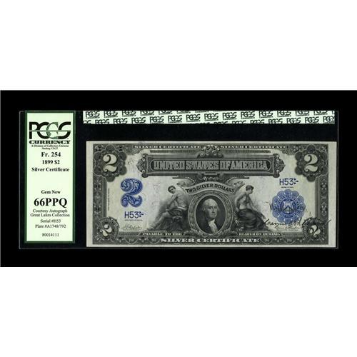 <B>Fr. 254 $2 1899 Silver Certificate Courtesy Autograph PCGS Gem New 66PPQ.</B></I> This Washington Deuce has so much going for it. It is well preserved with original surfaces and ample margins, it is from a better Friedberg number, it is courtesy autographed by Carmi Thompson, it carries serial number H53, and it once resided in the Great Lakes Collection. An exciting note and certainly one to be proud of.<BR><BR><b>Shipping:</b> Coin/Currency (<a target="_blank" href="http://www.heritageauctions.com/common/shipping.php">view shipping information</a>)