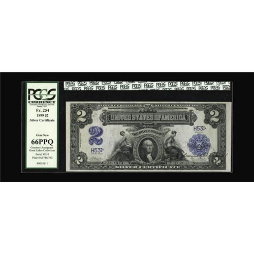 <B>Fr. 254 $2 1899 Silver Certificate PCGS Gem New 66PPQ.</B></I> This Washington Deuce has so much going for it. It is well preserved with original surfaces and ample margins, it is from a better Friedberg number, it is courtesy autographed by Carmi Thompson, it carries serial number H53, and it once resided in the Great Lakes Collection. An exciting note and certainly one to be proud of.