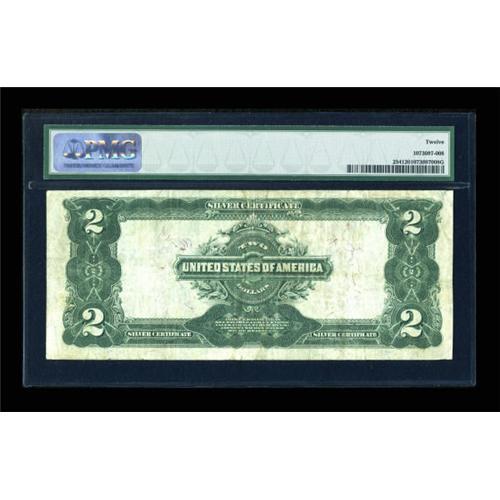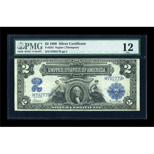 <B>Fr. 254 $2 1899 Silver Certificate PMG Fine 12.</B></I> Seventy-four examples of this number are known, which is quite scarce for an 1899 Silver Certificate. The Napier-Thompson signature combination carries a cachet that adds considerably to the value.<BR><BR><b>Shipping:</b> Coins & Currency (<a target="_blank" href="http://www.heritageauctions.com/common/shipping.php">view shipping information</a>)