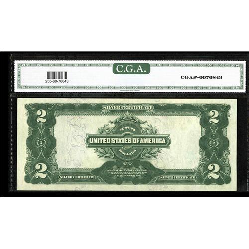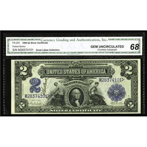 <B>Fr. 255 $2 1899 Silver Certificate CGA Gem Uncirculated 68.</B></I> A half dozen Burke Courtesy Autographs are known on this Friedberg number, and this note is a nice Gem note.