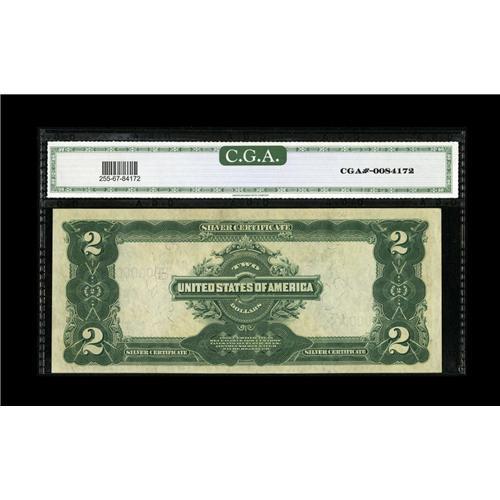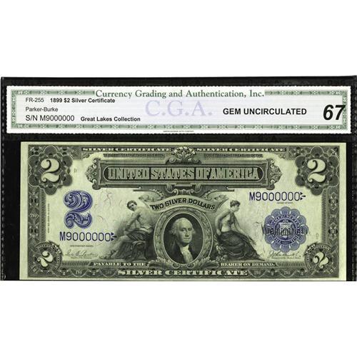 <B>Fr. 255 $2 1899 Silver Certificate CGA Gem Uncirculated 67.</B></I> Fancy serial number nine million graces this beauty that hails from the Great Lakes Collection.