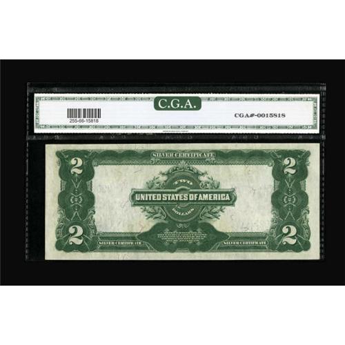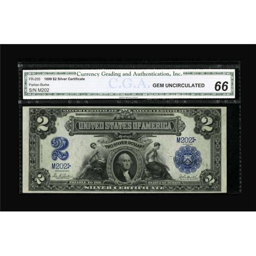 <B>Fr. 255 $2 1899 Silver Certificate CGA Gem Uncirculated 66.</B></I> Radar serial number M202 is seen on this lovely three digit example which is nicely margined, well centered and quite vivid.<BR><BR><b>Shipping:</b> Coins & Currency (<a target="_blank" href="http://www.heritageauctions.com/common/shipping.php">view shipping information</a>)