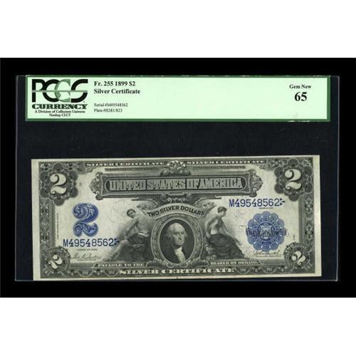 <B>Fr. 255 $2 1899 Silver Certificate PCGS Gem New 65.</B></I> This is a lovely example, with pleasing, even margins, and bright colors of the inks and paper. This type has been increasingly difficult to obtain in top grade in recent years.<BR><BR><b>Shipping:</b> Coins & Currency (<a target="_blank" href="http://www.heritageauctions.com/common/shipping.php">view shipping information</a>)