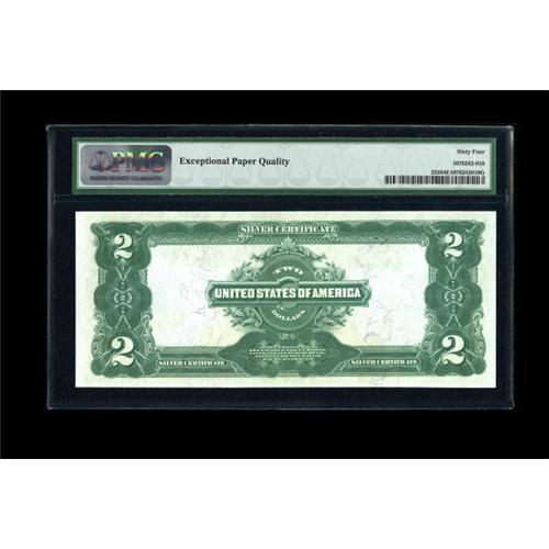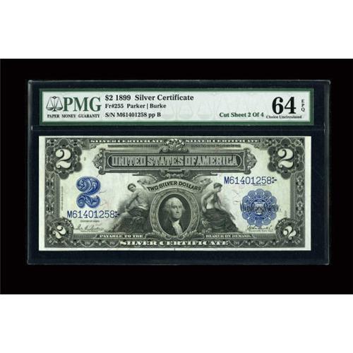 <B>Fr. 255 $2 1899 Silver Certificate PMG Choice Uncirculated 64 EPQ.</B></I> The second in an original cut sheet which is a little tighter along the top margin than the first note. Pleasingly bright and original with plenty of embossing present.<BR><BR><b>Shipping:</b> Coins & Currency (<a target="_blank" href="http://www.heritageauctions.com/common/shipping.php">view shipping information</a>)