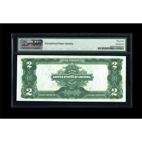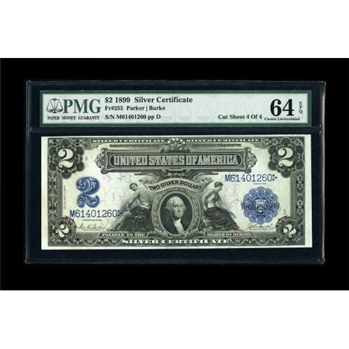 <B>Fr. 255 $2 1899 Silver Certificate PMG Choice Uncirculated 64 EPQ.</B></I> The last in this group of original notes once part of a sheet.<BR><BR><b>Shipping:</b> Coins & Currency (<a target="_blank" href="http://www.heritageauctions.com/common/shipping.php">view shipping information</a>)