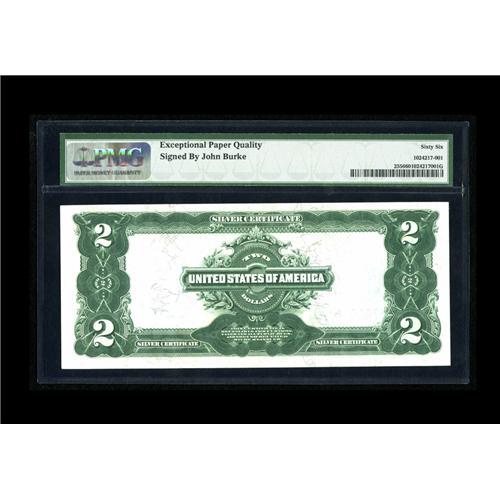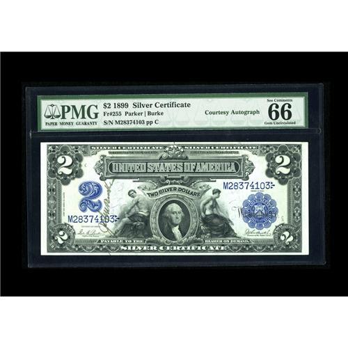 <B>Fr. 255 $2 1899 Silver Certificate Courtesy Autograph PMG Gem Uncirculated 66 EPQ.</B></I> A half dozen John Burke courtesy autographs are known on this number. This example enjoys virtually perfect centering and is enhanced by embossing that simply doesn't stop.<BR><BR><b>Shipping:</b> Coin/Currency (<a target="_blank" href="http://www.heritageauctions.com/common/shipping.php">view shipping information</a>)