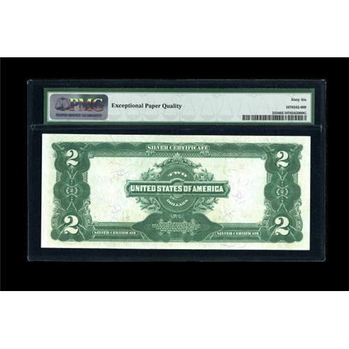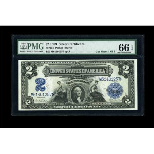 <B>Fr. 255 $2 1899 Silver Certificate PMG Gem Uncirculated 66 EPQ.</B></I> The first in a cut sheet of $2 Agricultural issues that are wholly original and loaded with eye appeal. The margins of this note are suitable for the grade and the deep inks quite vibrant.<BR><BR><b>Shipping:</b> Coins & Currency (<a target="_blank" href="http://www.heritageauctions.com/common/shipping.php">view shipping information</a>)