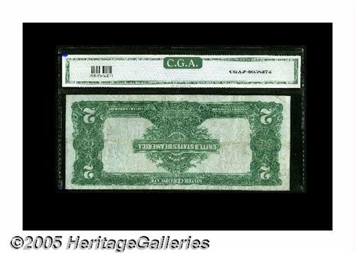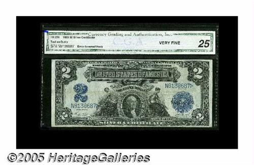 <B>Fr. 256 1899 $2 Silver Certificate Inverted Reverse CGA Very Fine 25.</B></I> Six inverts are recorded for this Friedberg number, all save one clustered in the same grade range as this piece. This problem free example has been slabbed and graded by CGA as Very Fine 25.