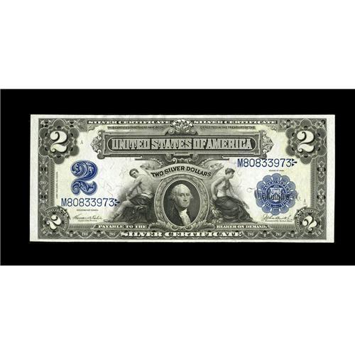 <B>Fr. 256 $2 1899 Silver Certificate About New.</B></I> A pair of light folds are seen on the surface of this colorful note.