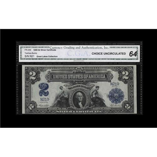 <B>Fr. 256 $2 1899 Silver Certificate CGA Choice Uncirculated 64.</B></I> An attractive 1899 Deuce, with both its value and appearance enhanced by the two-digit serial number N21.