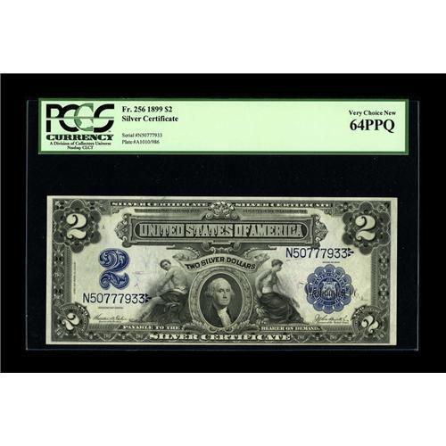 <B>Fr. 256 $2 1899 Silver Certificate PCGS Very Choice New 64PPQ.</B></I> A near Gem example of this perenially popular Deuce.<BR><BR><b>Shipping:</b> Coin/Currency (<a target="_blank" href="http://www.heritageauctions.com/common/shipping.php">view shipping information</a>)