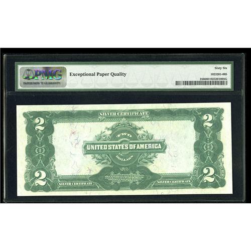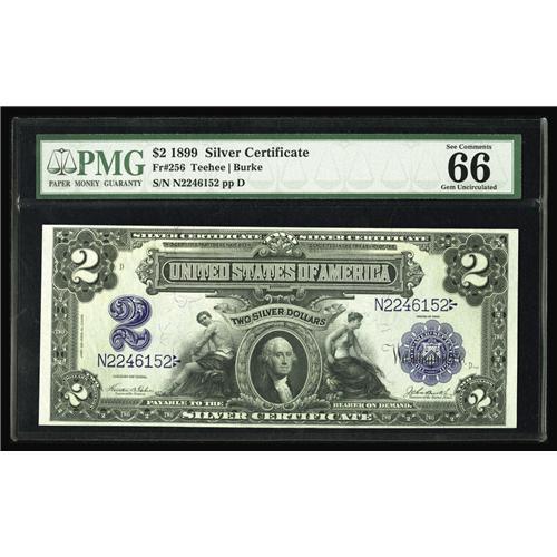 <B>Fr. 256 $2 1899 Silver Certificate PMG Gem Uncirculated 66.</B></I> A really handsome Silver Certificate Deuce that appears to be fully worth 66 money. The exceptional paper quality comment comes with the note and certainly seems to apply.