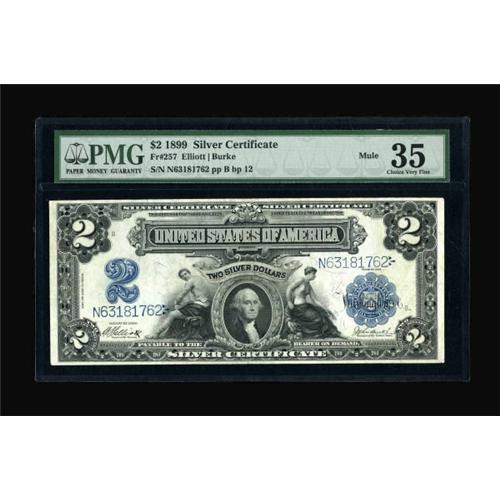 <B>Fr. 257 $2 1899 Mule Silver Certificate PMG Choice Very Fine 35.</B></I> This lovely mid-grade example carries Frank White Back Plate 12.<BR><BR><b>Shipping:</b> Coins & Currency (<a target="_blank" href="http://www.heritageauctions.com/common/shipping.php">view shipping information</a>)