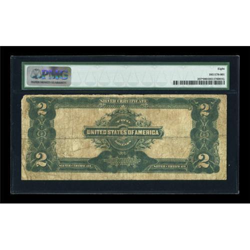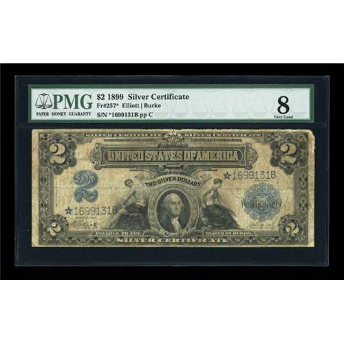 <B>Fr. 257 $2 1899 Silver Certificate Star Note PMG Very Good 8.</B></I> Light soiling which is commensurate with the grade appears on this scarcer $2 star. <BR><BR><b>Shipping:</b> Coins & Currency (<a target="_blank" href="http://www.heritageauctions.com/common/shipping.php">view shipping information</a>)