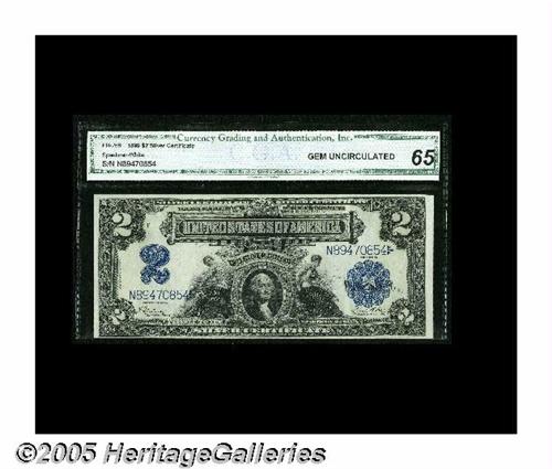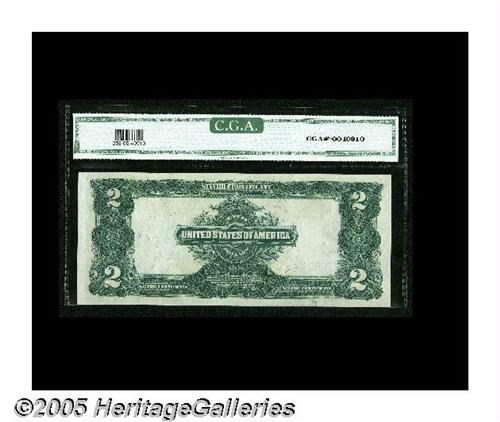 <B>Fr. 258 $2 1899 Silver Certificate CGA Gem Uncirculated 65.</B></I> This is the final signature combination of the 1899 Deuces, and its a note with original embossing deep enough to be easily seen through the third party holder.