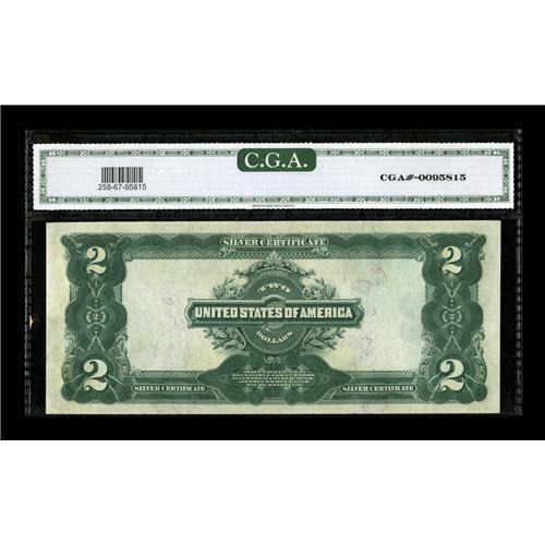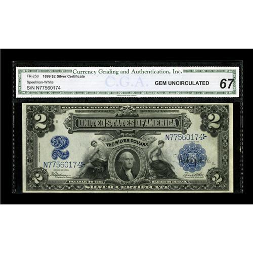 <B>Fr. 258 $2 1899 Silver Certificate CGA Gem Uncirculated 67.</B></I> Perfectly even margins and razor sharp corners are easily observed. The overall eye appeal is perfect, though a hint of handling is noted. This note is the second or B plate position from a cut sheet offered here tonight.<BR><BR><b>Shipping:</b> Coin/Currency (<a target="_blank" href="http://www.heritageauctions.com/common/shipping.php">view shipping information</a>)