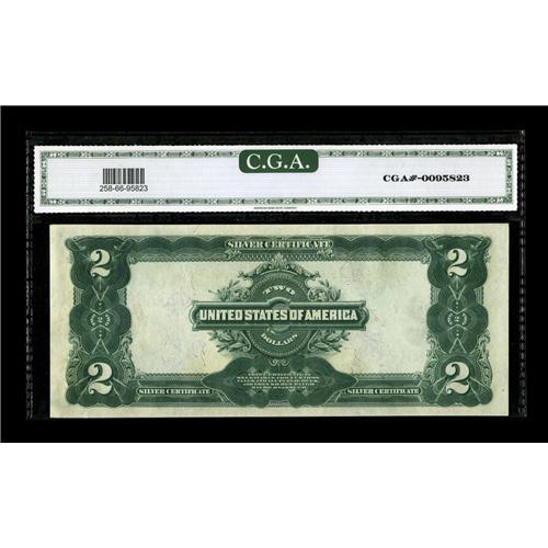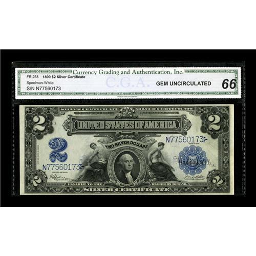 <B>Fr. 258 $2 1899 Silver Certificate CGA Gem Uncirculated 66.</B></I> Even margins frame this bright white issue. This is plate position A of a cut sheet offered in this sale.<BR><BR><b>Shipping:</b> Coin/Currency (<a target="_blank" href="http://www.heritageauctions.com/common/shipping.php">view shipping information</a>)