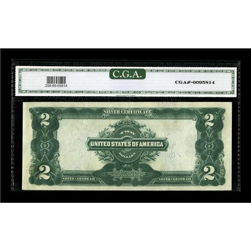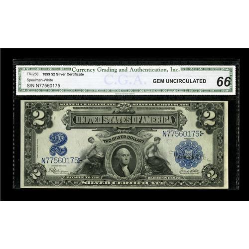 <B>Fr. 258 $2 1899 Silver Certificate CGA Gem Uncirculated 66.</B></I> This note, which is plate position C from a cut sheet offered here is identical to plate position A, though a hint of a corner bump is noted in the holder.<BR><BR><b>Shipping:</b> Coin/Currency (<a target="_blank" href="http://www.heritageauctions.com/common/shipping.php">view shipping information</a>)