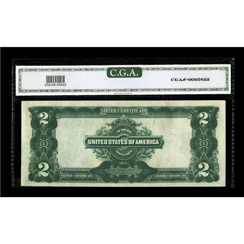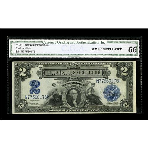 <B>Fr. 258 $2 1899 Silver Certificate CGA Gem Uncirculated 66.</B></I> This note is the plate position D note from the cut sheet offered here. It exhibits the same punch through embossing and vibrant colors. There is a hint of a corner bump on this note as well.<BR><BR><b>Shipping:</b> Coin/Currency (<a target="_blank" href="http://www.heritageauctions.com/common/shipping.php">view shipping information</a>)