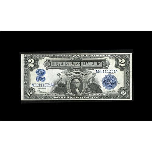 <B>Fr. 258 $2 1899 Silver Certificate Choice About New.</B></I> A hint of a center bend is noted, but could not be ignored for the sake of accuracy. The note overall, boasts all the attributes of a blazing Gem including perfectly sized margins, original paper, and deep, bold printing.