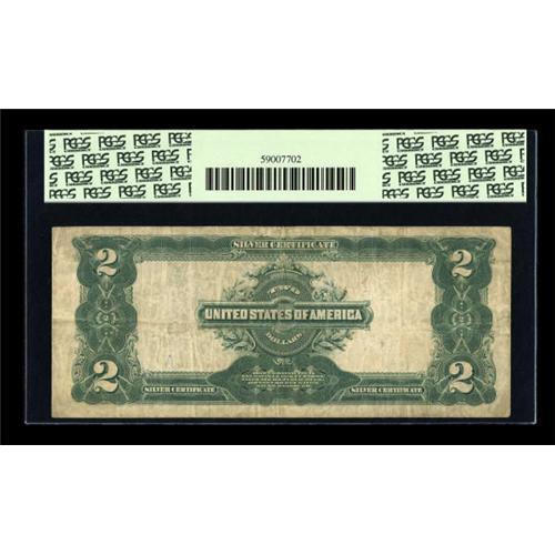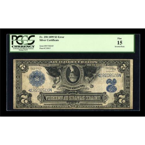<B>Fr. 258 $2 1899 Silver Certificate PCGS Fine 15.</B></I> With only three notes recorded in census data for this error, this is the first appearance in one of our auctions in the past six years. Decent color remains on this elusive $2 Silver invert.<BR><I>From The Amelia Island Collection.</B></I><BR><BR><b>Shipping:</b> Coins & Currency (<a target="_blank" href="http://www.heritageauctions.com/common/shipping.php">view shipping information</a>)