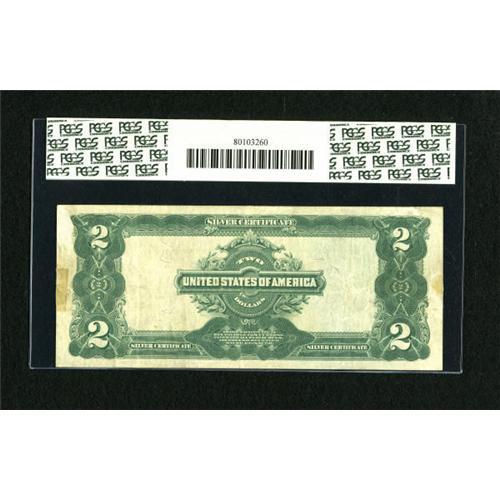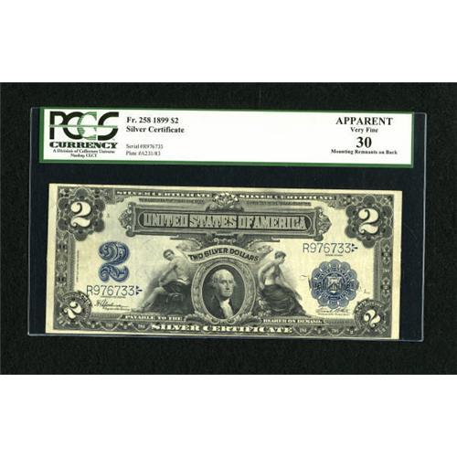 <B>Fr. 258 $2 1899 Silver Certificate PCGS Apparent Very Fine 30.</B></I> A couple of stamp hinges are noted on the back, thus rendering this piece an "apparent" grade. The overall appearance is still quite pleasing.<BR><I>From The Kansas City Collection</B></I><BR><BR><b>Shipping:</b> Coins & Currency (<a target="_blank" href="http://www.heritageauctions.com/common/shipping.php">view shipping information</a>)