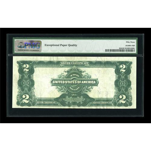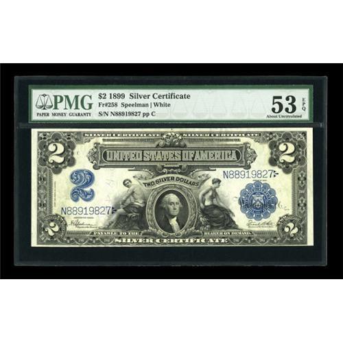 <B>Fr. 258 $2 1899 Silver Certificate PMG About Uncirculated 53 EPQ.</B></I> A lightly circulated Agricultural $2 that exhibits a center fold and light handling.<BR><BR><b>Shipping:</b> Coins & Currency (<a target="_blank" href="http://www.heritageauctions.com/common/shipping.php">view shipping information</a>)