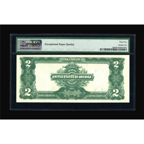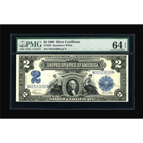 <B>Fr. 258 $2 1899 Silver Certificate PMG Choice Uncirculated 64 EPQ.</B></I> Only a hair-thin lower margin has relegated this lovely note to choice plus status. These surfaces still look much the same as when it was first printed.<B><BR></B></I><I>From The Warren Marshall Collection</B></I><BR><BR><b>Shipping:</b> Coins & Currency (<a target="_blank" href="http://www.heritageauctions.com/common/shipping.php">view shipping information</a>)